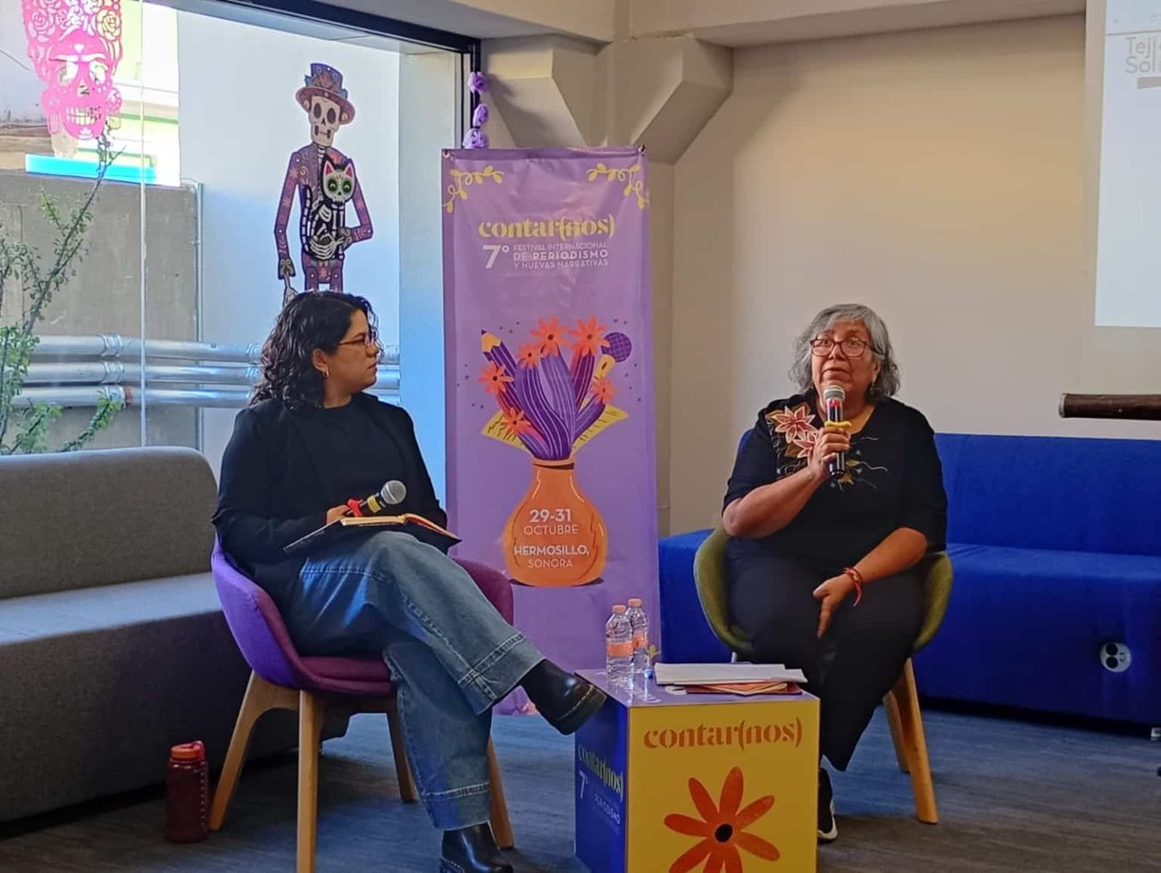 La defensora de los derechos humanos Griselda Triana, de Tejidos Solidarios, durante su participación en el festival Contar(nos) Mx, realizado en Sonora (Foto: Judith León).