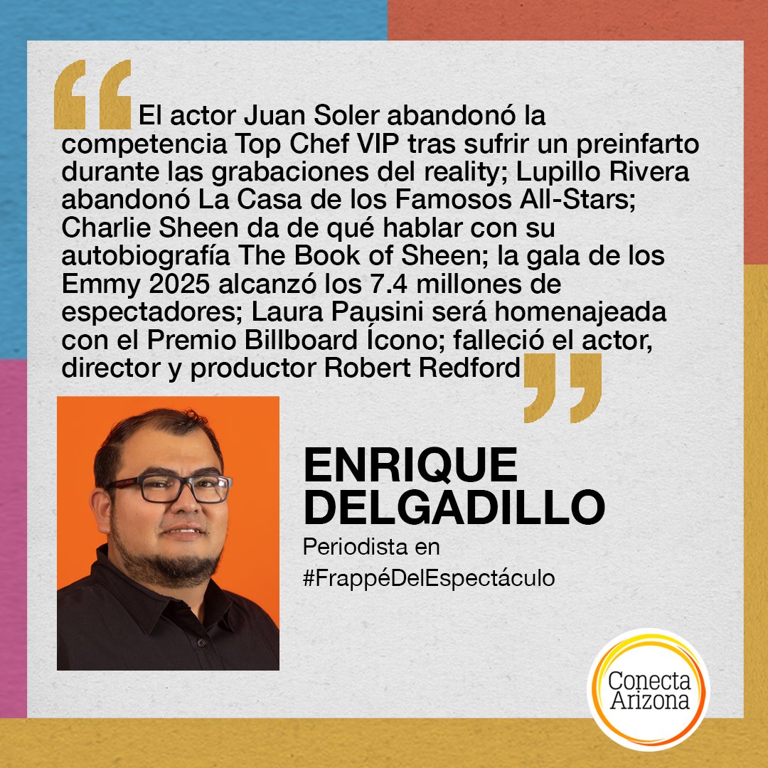 ➡️ Enrique Delgadillo presenta noticias de artistas en Estados Unidos y de México: “El actor argentino Juan Soler se vio obligado a abandonar la competencia culinaria Top Chef VIP tras sufrir un preinfarto durante las grabaciones finales del reality show de Telemundo; Lupillo Rivera, uno de los rostros más reconocidos del regional mexicano, ha revelado una difícil situación personal que lo llevó a abandonar la competencia de La Casa de los Famosos All-Stars; Charlie Sheen vuelve a dar de qué hablar con su autobiografía The Book of Sheen; los Emmy 2025 rompieron récords y la gala alcanzó los 7.4 millones de espectadores, la