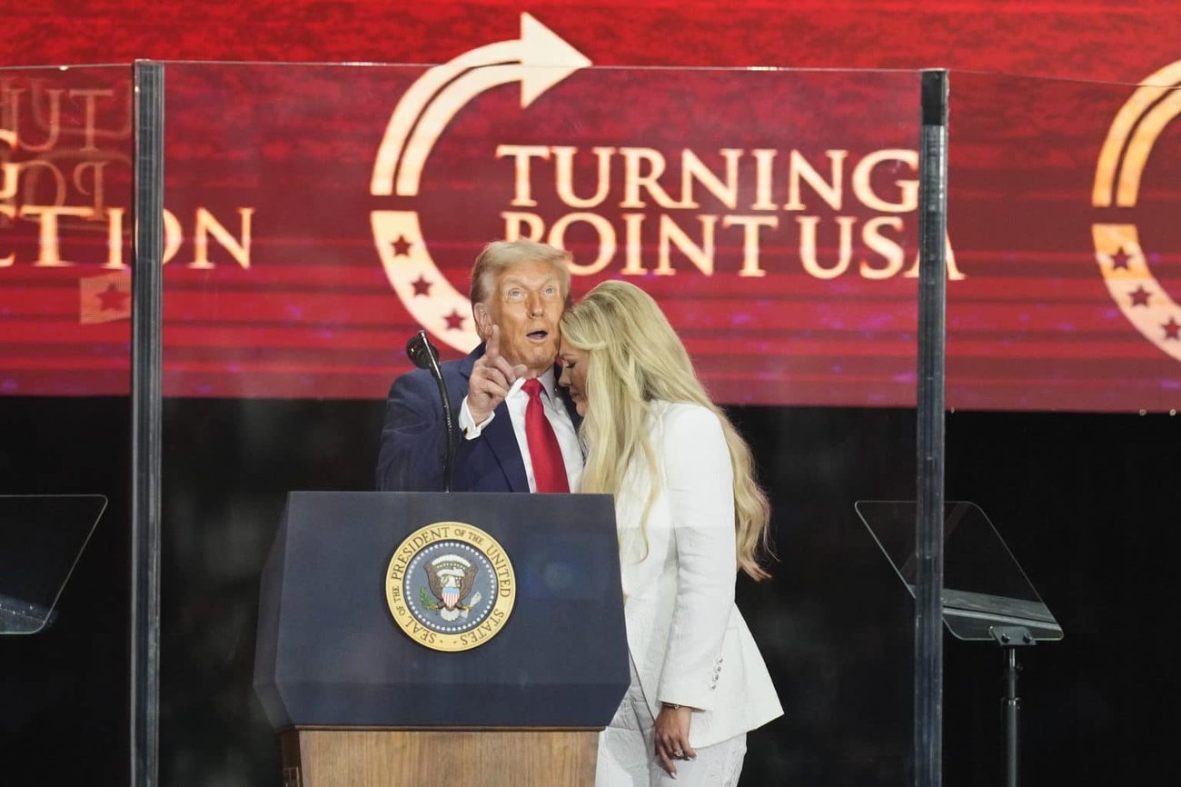 Erika Kirk abraza al presidente Trump durante el servicio conmemorativo por Charlie Kirk, el domingo 21 de septiembre de 2025, en el State Farm Stadium en Glendale, Arizona (Foto: John Locher/AP).