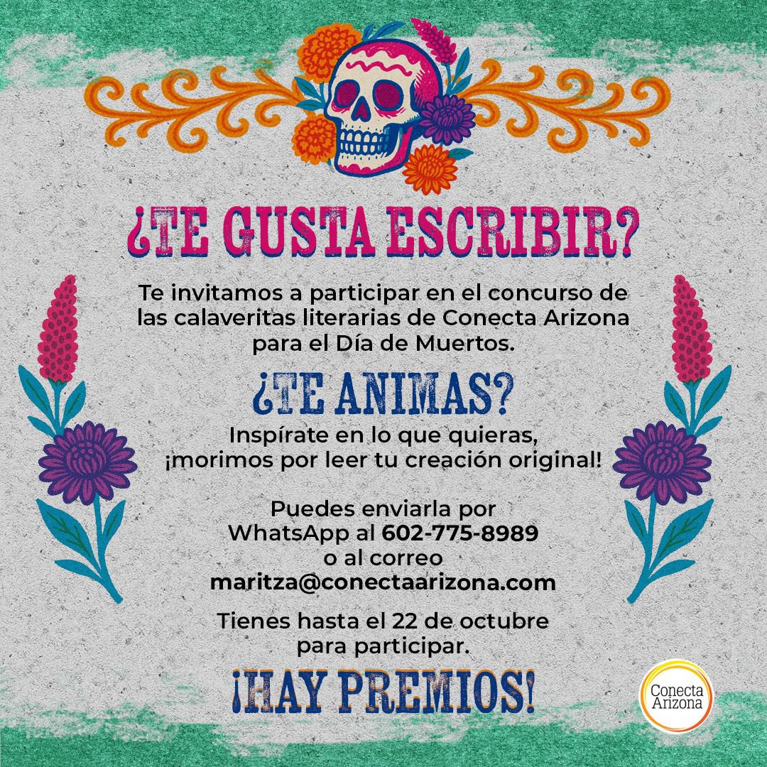 💀 Además, como cada año, en Conecta Arizona te invitamos a participar en nuestro tradicional concurso de calaveritas literarias por el Día de Muertos. Envíanos tu calaverita y nosotros te la diseñamos y publicamos en todas nuestras plataformas y redes sociales. |